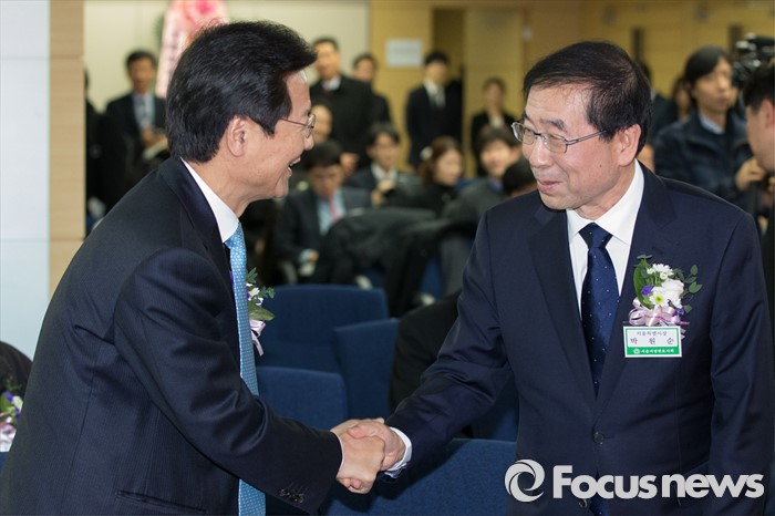 (서울=포커스뉴스) 11일 오후 서울 서초구 변호사회관에서 열린 '조영래 변호사 25주기 기념행사'에 문재인(왼쪽) 새정치민주연합 대표와 박원순 서울시장이 참석해 인사를 하고 있다.