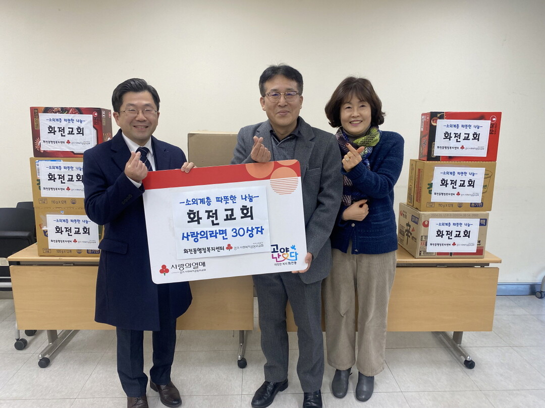 이번 후원물품은 화전동의 어려운 이웃을 위해 교회의 연말 모금행사를 통해 마련한 것으로, 독거노인 등 관내 취약계층에 전달될 예정이다.