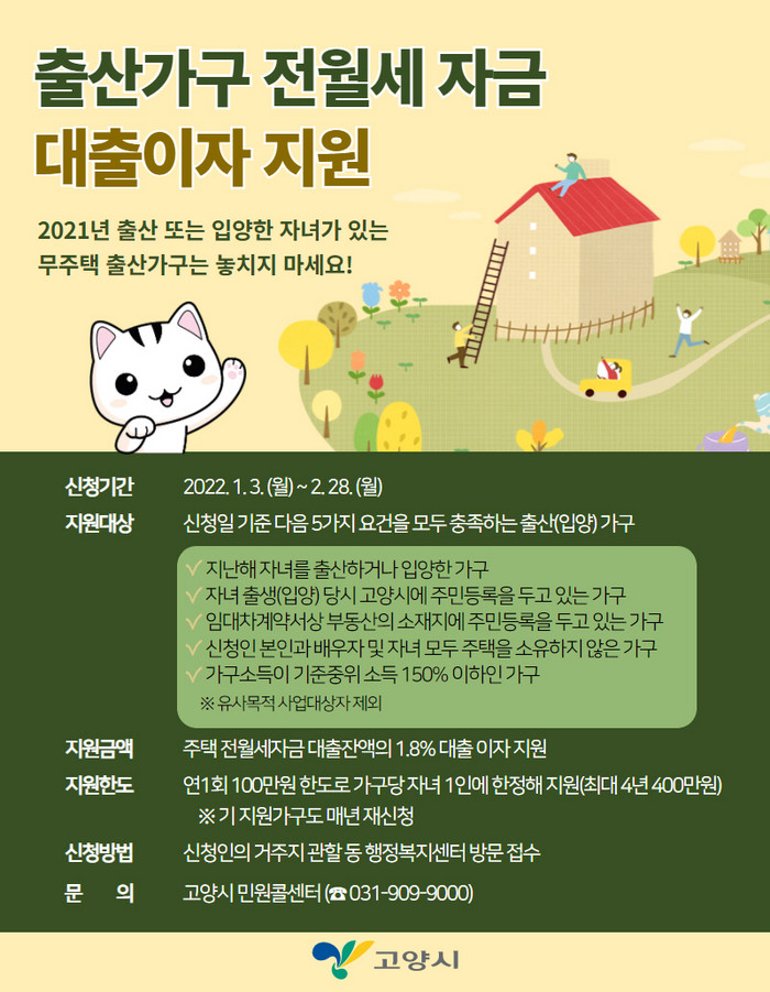 [부자동네타임즈 김인수기자] 고양시는 무주택 출산가구의 주거비 부담을 줄이기 위해 ‘2022년 고양시 출산가구 전월세자금 대출이자 지원’ 신청을 받는다.