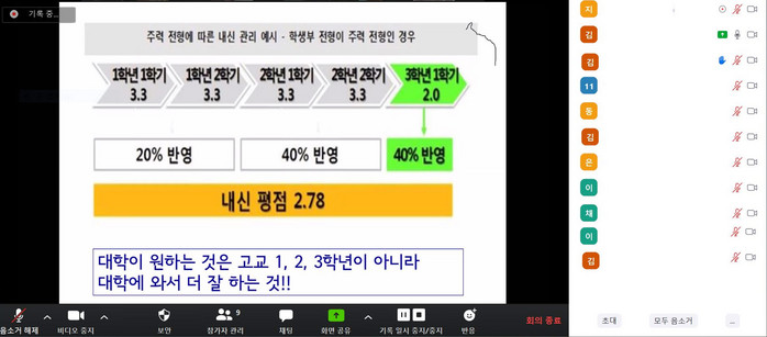 이번 컨설팅은 코로나19 예방을 위해 온라인 개별 상담 방식으로 시행했으며, 주요 내용으로 2022학년도 수시·정시 전형 및 주요 학과 설명, 학생부 전형 특강으로 학생부 종합전형 준비와 지원전략 등을 소개했다.