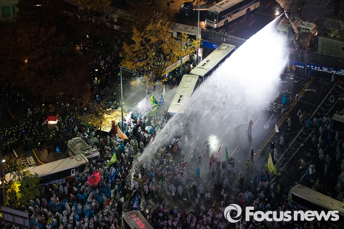 | △ 지난달 14일 오후 서울 종로구 세종대로에서 열린 정부 규탄 '민중총궐기 투쟁대회'에서 경찰이 시위대를 향해 물대포를 쏘고 있다. <사진제공=포커스뉴스> |