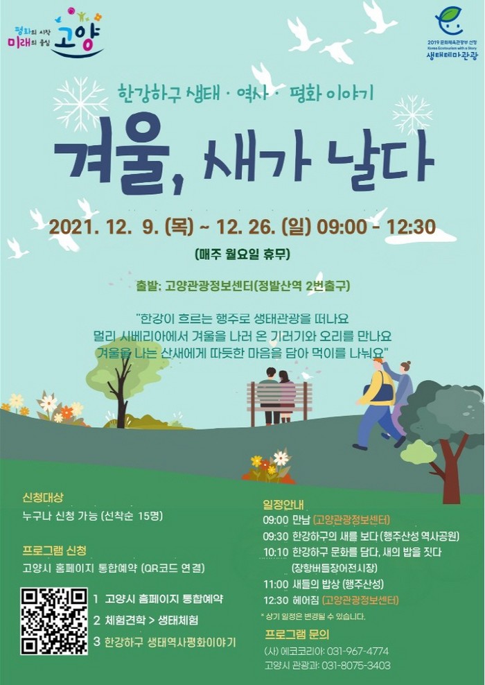시의 생태관광 겨울편 ‘겨울, 새가 날다’는 12월 9일부터 26일까지 총 16회 운영한다. 이번 프로그램 구간은 정발산역 고양관광정보센터에서 행주나루터까지 시티투어 버스로 이동한 뒤 올해 조성된 고양한강평화공원과 새롭게 단장한 한강변 군 간이초소에서 지역의 평화역사 해설을 듣게 된다. 이후 행주산성역사공원 및 행주산성에서 서식하는 산새들의 겨울나기를 위해 먹이주기 체험을 한다.