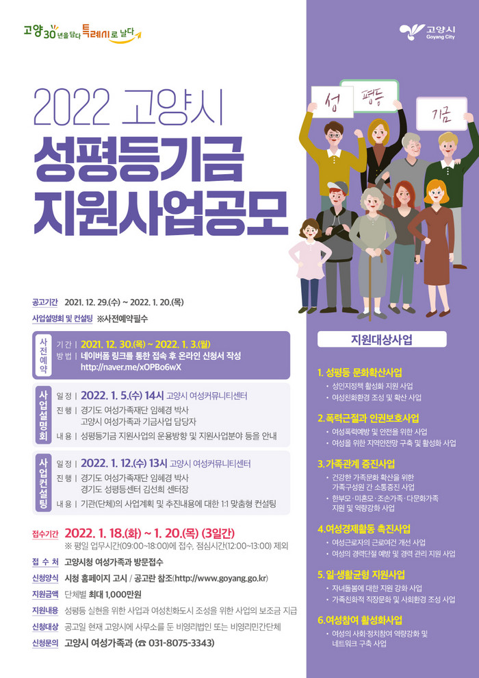 신청기간은 2022년 1월 18일부터 20일까지이며 고양시청 여성가족과로 방문 접수해야 한다. 접수된 사업은 사업의 적합성, 금액산정의 적정성, 단체 수행 능력 등을 고려해 고양시 성평등위원회의 심사를 받는다. 시는 2월 중 지원 단체를 최종 선정할 예정이다.