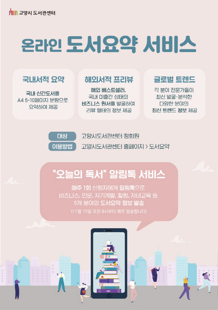 온라인 도서요약 서비스는 고양시도서관센터 홈페이지를 통해 국내서적 요약, 해외서적 프리뷰, 글로벌 트렌드 정보 등을 제공하는 서비스로 인문, 경제, 교양서 등 연간 1,000여권의 도서에 대한 핵심 요약정보를 제공한다.
