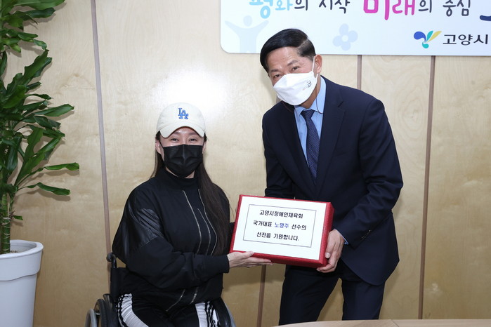 [부자동네타임즈 김인수기자] 고양시가 지난 23일 열린회의실에서 고양시장애인체육회 소속 국가대표 선수인 아이스하키 최배석, 김상락, 볼링 김은효, 스포츠댄스 노명주, 수영 염준두 선수를 격려하고 의견을 청취하는 자리를 가졌다.