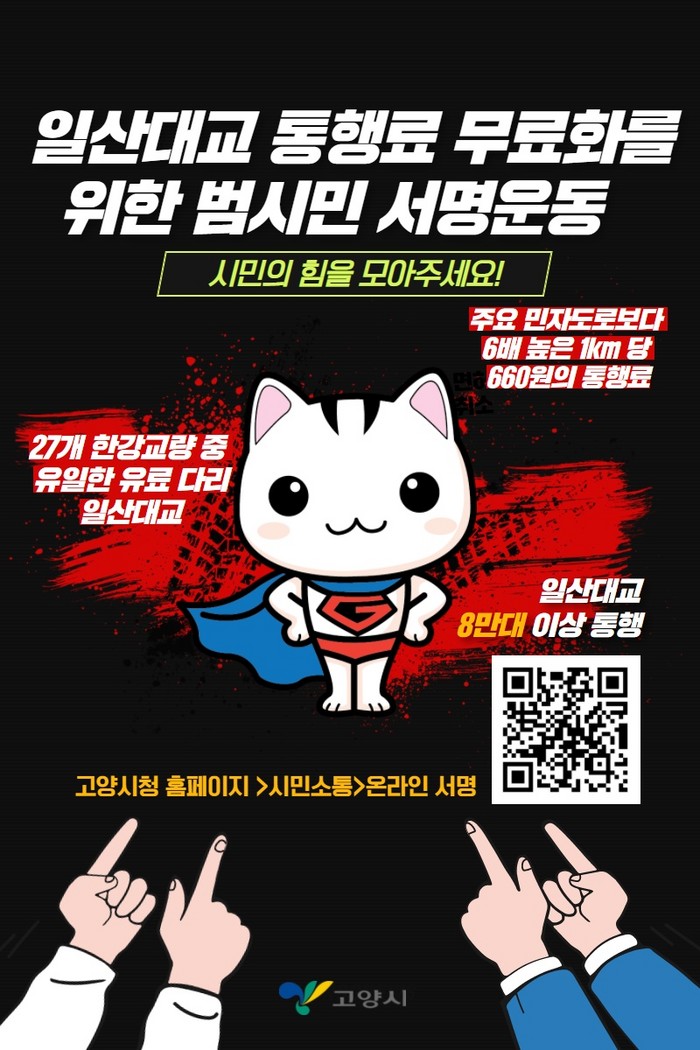 [부자동네타임즈 김인수기자] 고양시가 "24일 일산대교 통행료 무료화를 위한 범시민 서명운동을 진행하고 있다."고 밝혔다.