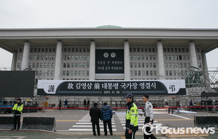(서울=포커스뉴스) 故 김영삼 전 대통령 국가장 영결식을 이틀 앞둔 24일 오후 서울 여의도 국회 본청 앞에서 관계자들이 영결식 준비를 하고 있다.