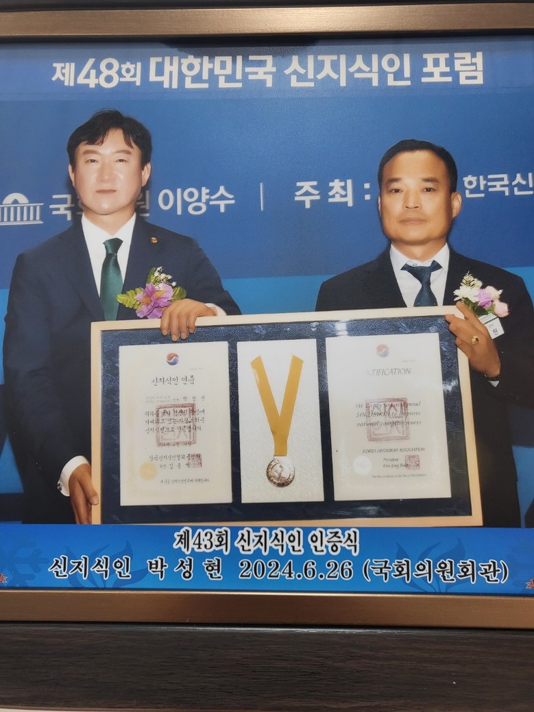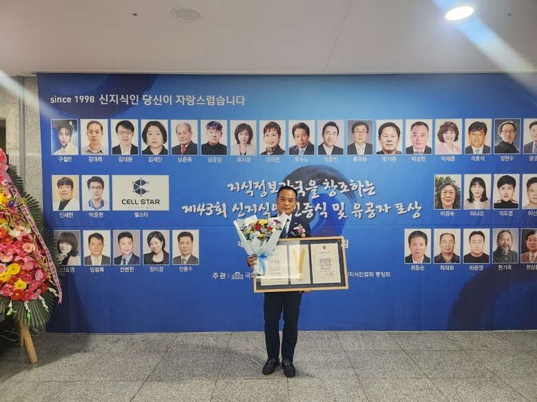제43회 신지식인 인증식에서 김종백 회장(왼쪽)이 올해 처음 신설된 신지식 기업에 선정된 셀스타 배건식 회장에게 시상하고 있다.