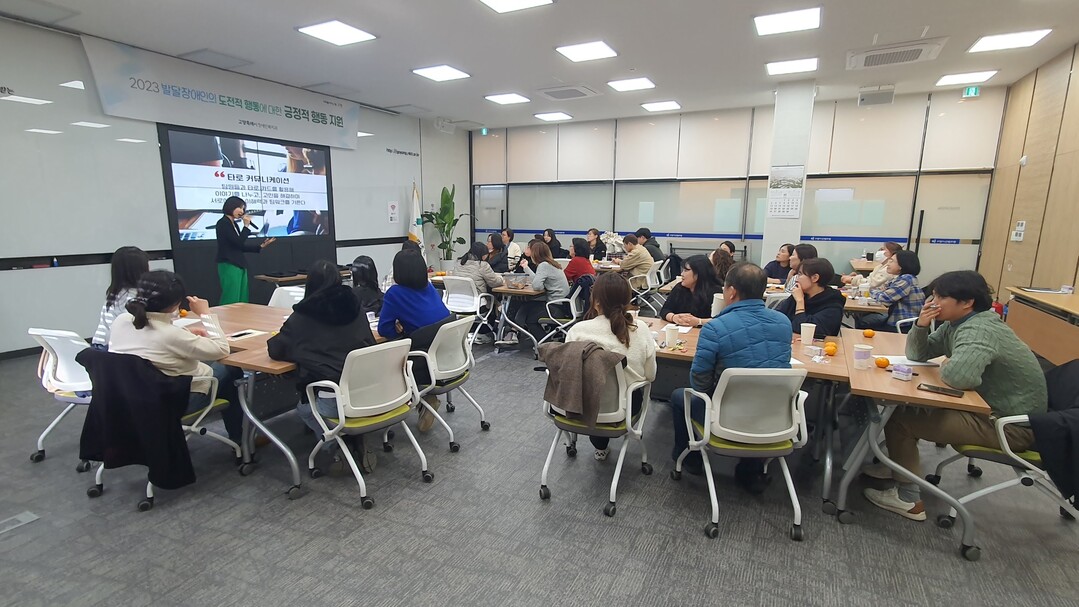 2023년 긍정적 행동지원 사업은 광운대학교 상담복지정책대학원 김고은 교수가 진행했다. 지난 6월 20일부터 11월 24일까지 진행된 교육에 관내 발달장애인 복지기관 21개소 69명의 종사자가 참여했다