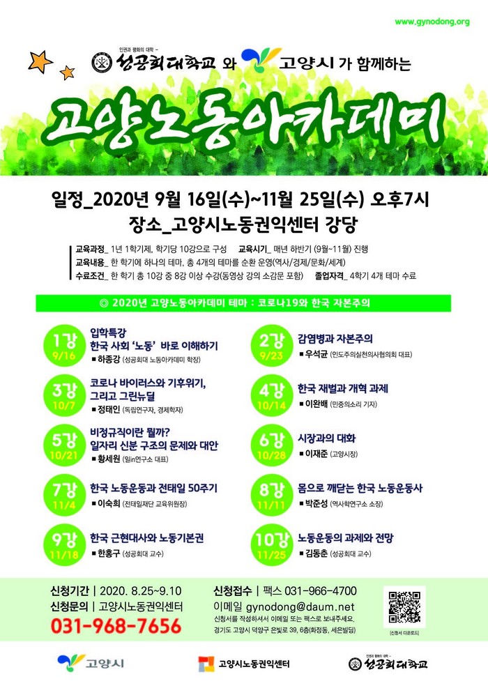 고양 노동아카데미는 9월16일(수) 입학식 및 1강을 시작으로 11월25일(수)까지 매주 수요일 오후 7시부터 9시까지 진행되며 수료 조건은 10강 중 8강 이상 수강해야 한다.