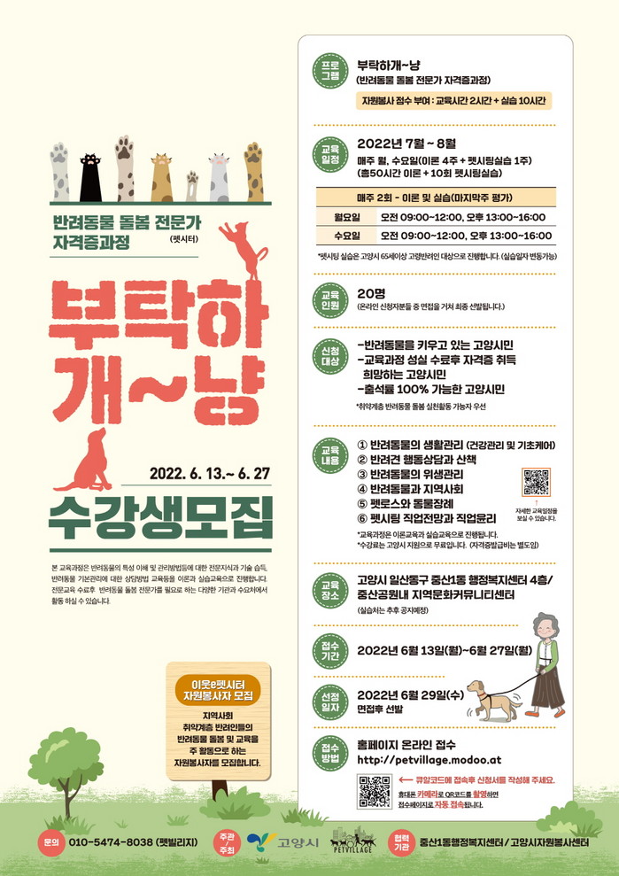 교육은 반려동물을 키우고 있거나 자격증 취득을 희망하는 고양시민이라면 누구나 신청할 수 있다. 시는 신청자 중 지역사회 취약계층 반려동물 돌봄 봉사활동이 가능한 시민을 우선 선발할 예정이다.