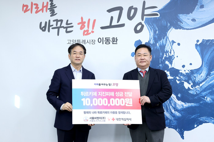 [부자동네타임즈 김인수기자] 고양시에 소재한 서울도시가스그룹 서울씨엔지(주)에서 유례없는 대지진으로 대규모 피해를 본 튀르키예·시리아 지역을 위해 성금 1천만원을 기탁했다. 시는 15일 고양시청에서 전달식을 열었다.