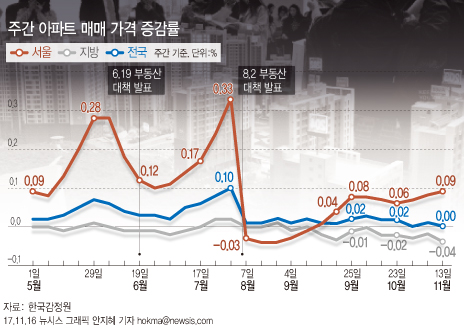 16일 한국감정원이 발표한 주간 아파트가격 동향에 따르면 전국 매매가격은 전주 상승(0.02%)에서 보합 전환했다. 서울은 지난달 셋째주 0.06%에서 매주 0.01%포인트씩 확대되고 있다