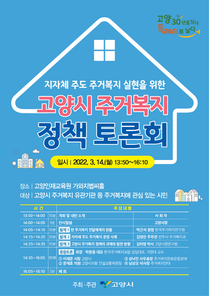 이번 정책 토론회를 통해 시는 지자체 주도의 주거복지 실현을 위한 주거복지 전담부서를 마련하고 고양시 주거복지 발전을 위한 복지정책의 과제와 발전 방향을 논의할 예정이다. 좌장은 박환용 한국주거복지포럼 상임대표가 맡는다.