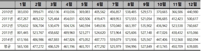 | △ 장 감염 월별 진료인원(2010년~2014년) <자료출처=건강보험심사평가원> |