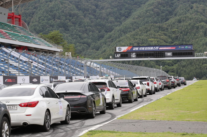 [사진설명] 2019년 강원국제모터페스타에서 진행한 에코랠리에 출전한 차량들이 인제 스피디움에 줄지어 서있다.