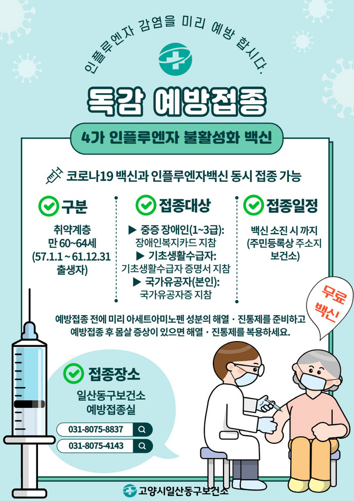 [부자동네타임즈 김인수기자] 고양시 덕양구·일산동구·일산서구 3개구 보건소에서 인플루엔자 유행 대비 인플루엔자 무료 예방접종 사업을 실시한다.