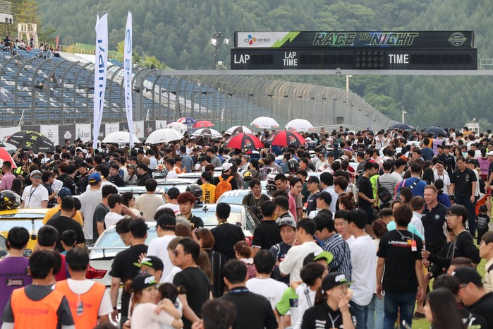 [사진설명] 지난 7월 인제 스피디움에서 열린 2019 CJ대한통운 슈퍼레이스 챔피언십 4라운드 나이트 레이스 당시 수많은 관람객들이 그리드워크 행사에 참여해 서킷을 가득 메우고 있다.