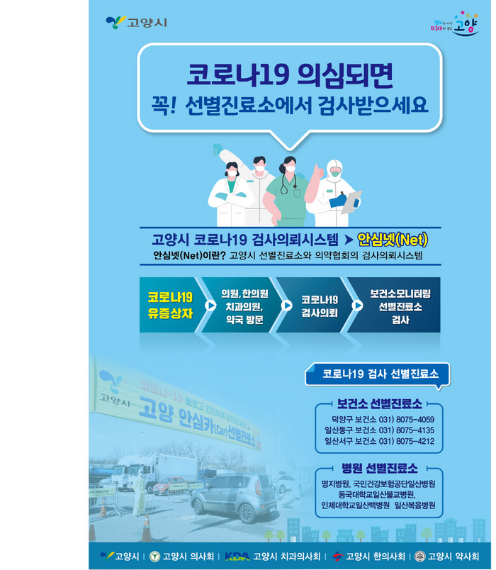 [부자동네타임즈 김인수기자] 고양시는 코로나19 지역감염 조기 대응을 위해 고양시 4개 의약협회와 선별진료소 간 ‘코로나19 고양 안심넷(Net)’을 구축해 운영한다고 21일 밝혔다.