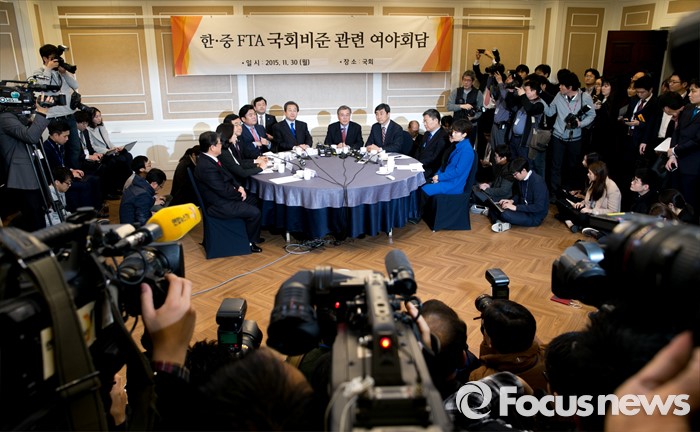 (서울=포커스뉴스) 30일 오후 서울 여의도 국회 귀빈식당에서 열린 한중 FTA 국회비준 관련 여야 지도부 회담에 참석한 의원들이 취재진을 향해 발언하고 있다.