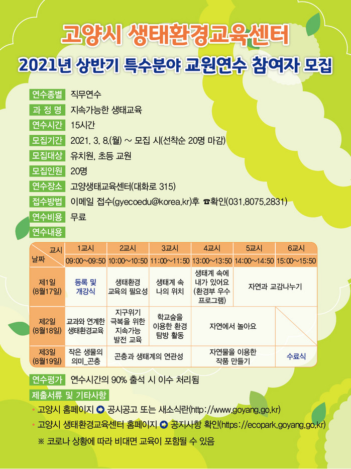 2021년 상반기 특수분야 교원연수기관으로 지정받은 고양시 생태환경교육센터는 교사들이 학교에서 활용 가능한 지속가능한 생태교육 프로그램으로 이번 교원연수 과정을 개설해, 여름방학 기간인 오는 8월 17일부터 19일까지 3일간 무료교육을 실시한다.