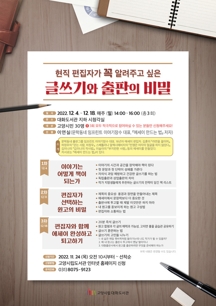 이번 프로그램은 유명 편집자인 이연실 문학동네 출판그룹 임프린트 이야기장수 대표가 진행한다. 글쓰기 역량을 키우는 것에 관심이 있는 고양시민 30명을 대상으로 매주 일요일 오후 2시부터 4시까지 운영한다.