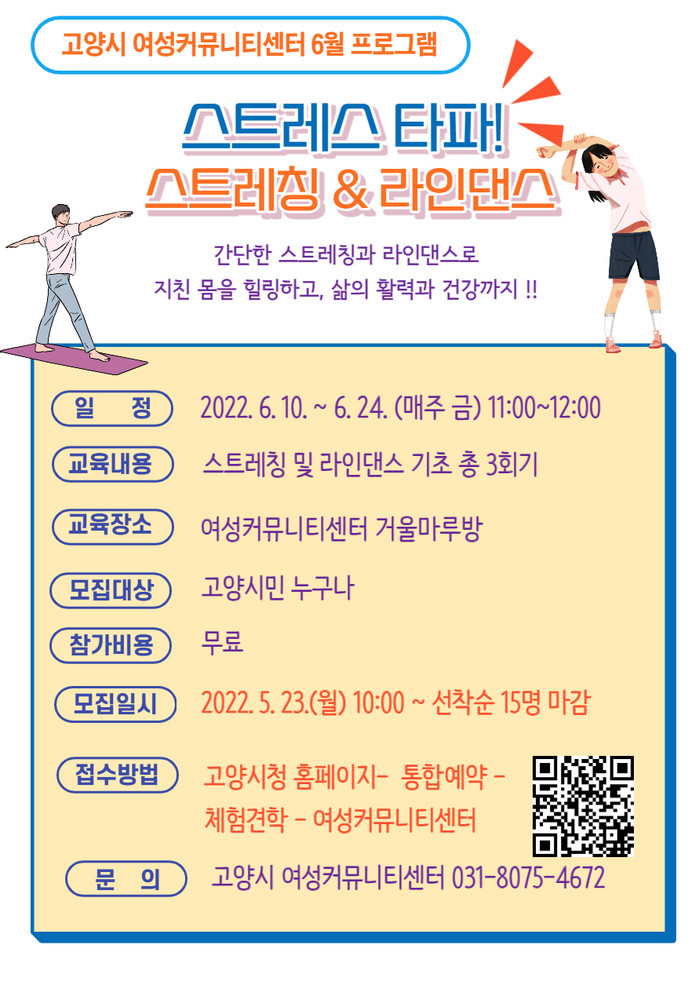 [부자동네타임즈 김인수기자] 고양시 여성커뮤니티센터에서 5월 23일(월)부터 지친 몸을 힐링하고 삶의 활력을 주는 ‘스트레스 타파!! 스트레칭&라인댄스’ 참여자를 모집한다.
