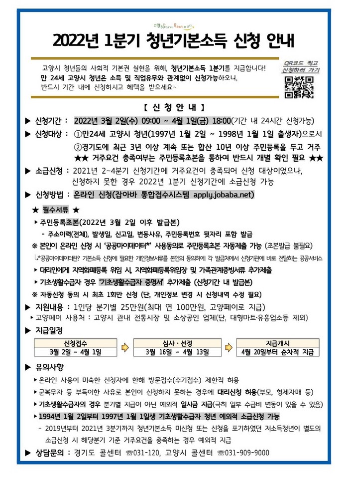 지난해 2분기 ~ 4분기 청년기본소득 지급대상자에 해당하지만 신청하지 못한 청년은 이번 1분기에 소급해서 신청하면 추가로 지급받을 수 있다. 기타 자세한 사항은 경기도 일자리플랫폼 잡아바 홈페이지 및 고양시 콜센터로 문의하면 된다.