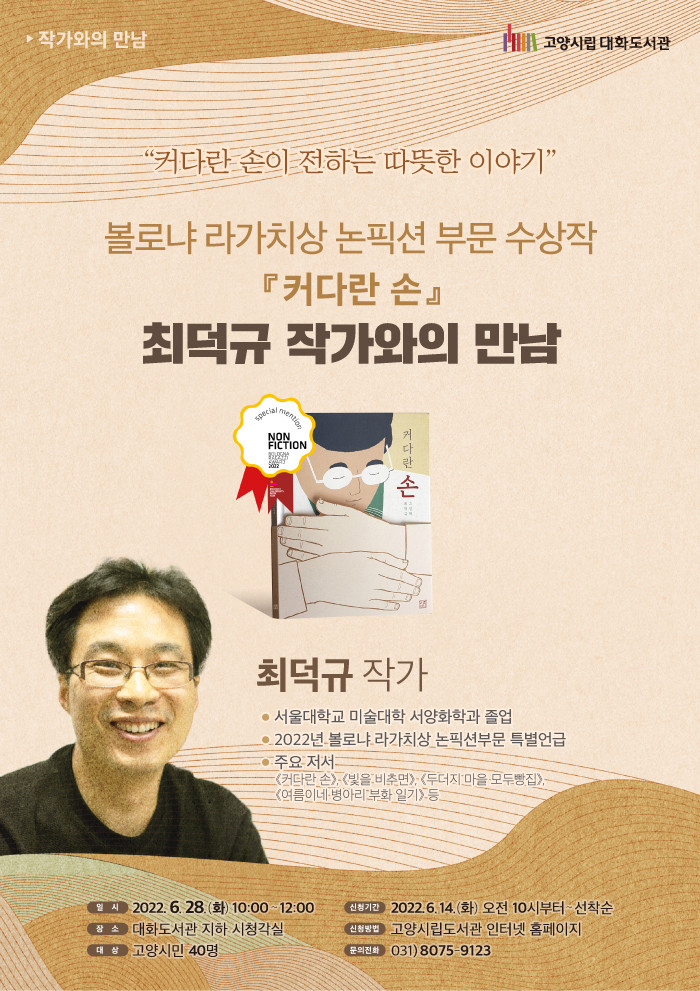 대화 도서관은 6월 28일 최덕규 작가와의 대면 만남을 준비했다. 작가는 라가치상 수상작인 커다란 손의 작품 이야기와 작가의 아버지에 대한 이야기를 나누고 그림책 창작의 즐거움에 대해 강연한다. 작가와의 만남은 지하 시청각실에서 진행된다.