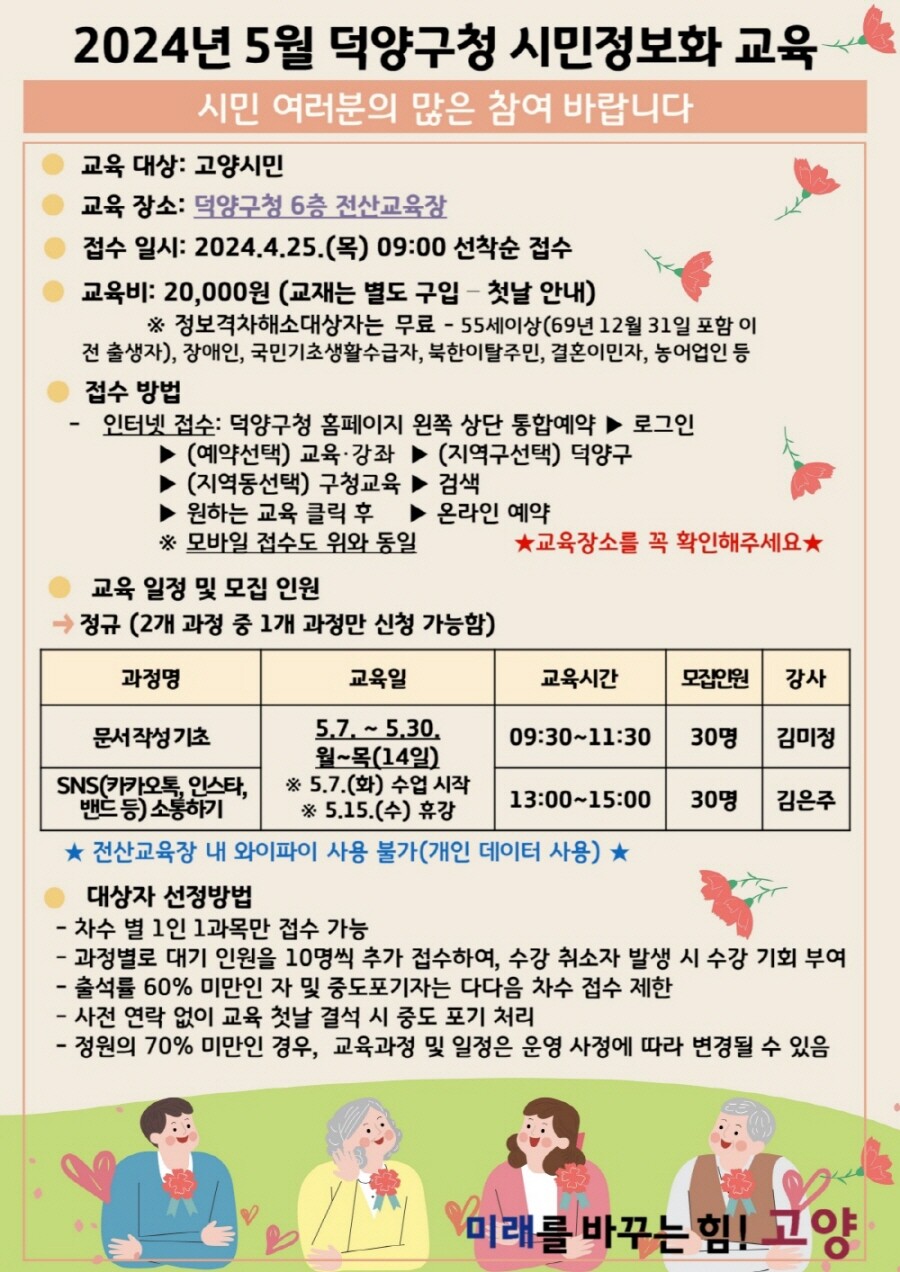 제3차 시민정보화교육은 5월 7일부터 5월 30일까지 주 4일(월~목) 덕양구청 6층 전산교육장에서 진행된다.