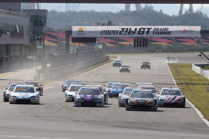 [사진설명] 전남 영암 코리아 인터내셔널 서킷에서 2020 전남GT 슈퍼 6000 클래스 차량들이 질주하고 있다.