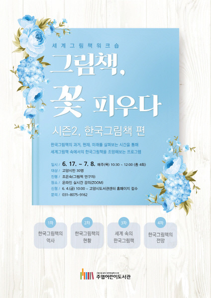 [부자동네타임즈 김인수기자] 고양시 주엽어린이도서관이 오는 17일부터 세계그림책 워크숍 ‘그림책, 꽃피우다 시즌2–한국그림책 편’을 운영한다.