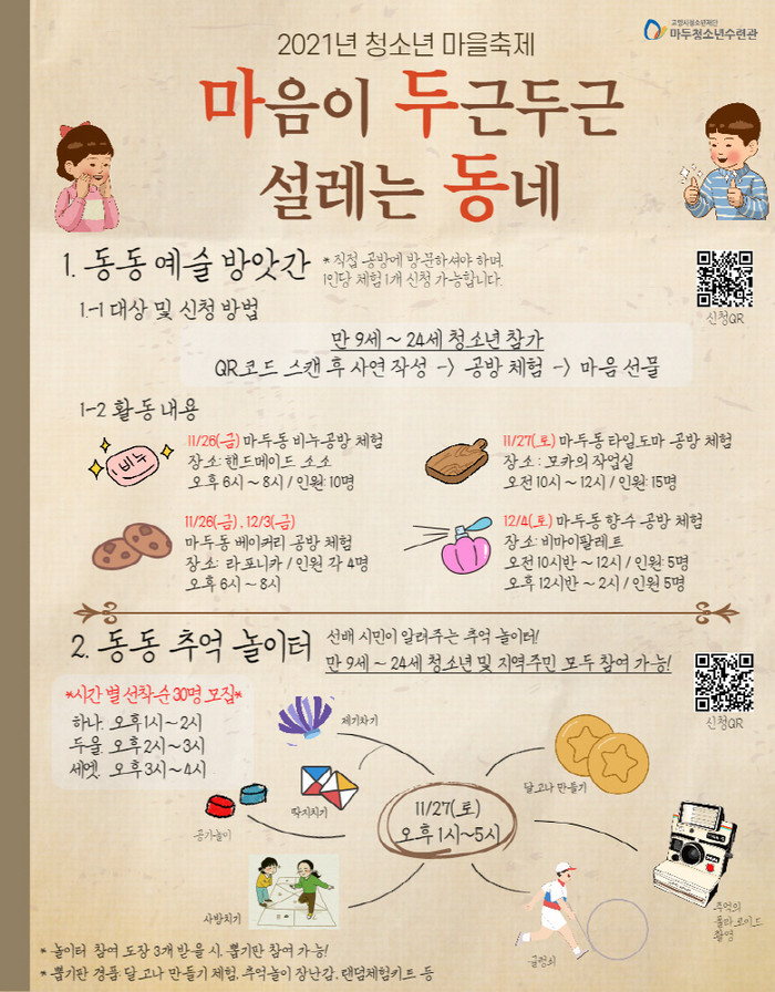 마을축제는 오는 11월 26일부터 12월 4일까지 열리는 행사로 마두동에 위치한 공방, 학교, 일산노인종합복지관 등과 연계하여 청소년들이 지역사회에서 여가생활을 보낼 수 있도록 준비하였다.