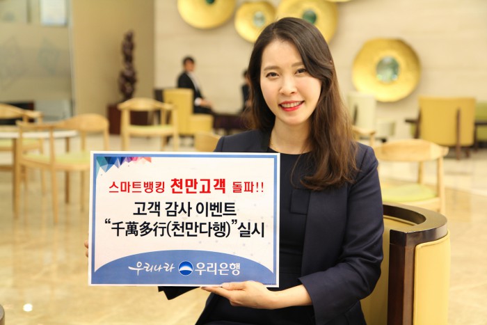 [부자동네타임즈 이현재 기자] 우리은행이 스마트뱅킹 가입고객 1000만명 돌파를 기념해 '천만고객이 행복해지는 천만다행(千萬多幸) 감사 이벤트'를 3일부터 내년 1월말까지 진행한다.