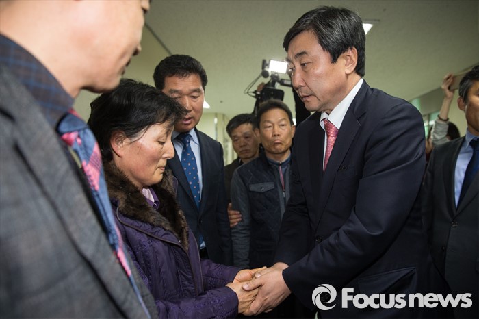 (서울=포커스뉴스) 16일 오전 새정치민주연합 이종걸 원내대표가 서울대병원 중환자실 로비에 있는 백남기(69세) 농민의 부인과 딸을 만나 위로하고 있다.