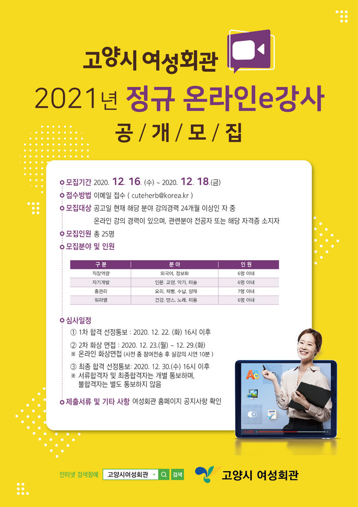 [부자동네타임즈 김인수기자] 고양시 여성회관이 2021년 온라인강좌 확대 개편을 위해 시행한 ‘2021년 고양시 여성회관 정규 온라인e강사 공개모집’ 결과를 오늘 30일 발표했다.