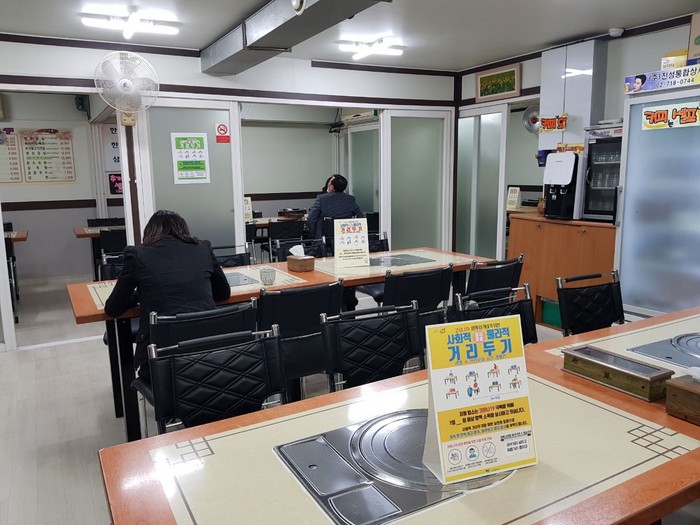 ‘물리적 거리(2m) 두기’캠페인이란, 음식점 ‧ 미용실 등과 같은 다중이용시설에서 ‘좌석 한 칸씩 띄고 앉기, 마주보고 앉지 않기’등을 통해 사람 간 접촉을 줄임으로써 코로나19 확산을 방지하고자 하는 것이다.
