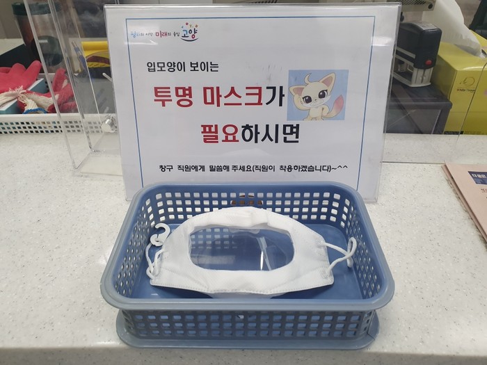 일명 ‘립뷰(lip-view)’ 마스크인 이 투명마스크는 마스크 가운데가 투명하게 처리돼 입모양과 표정이 훤히 보이는 것으로, 청각장애인의 민원실 방문 시 담당직원이 착용 후 응대하기 위해 고양시가 민원실에 비치한 물품이다.