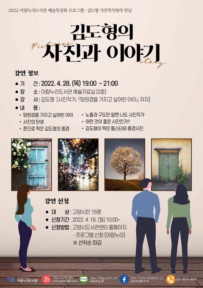 [부자동네타임즈 김인수기자] 고양시 아람누리도서관은 오는 4월 28일(목) 오후 7시 김도형 사진작가와의 만남을 개최한다.