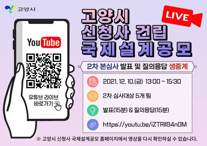이번 생중계는 유튜브를 통해 시청할 수 있으며, 생중계 영상은 추후 고양시 신청사 국제설계공모 공식 홈페이지에서 다시 확인 할 수 있다.