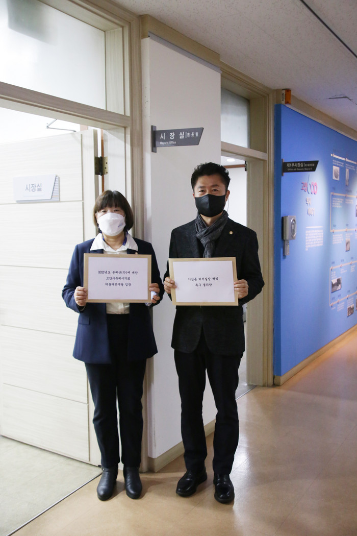 [사진설명] 고양시특례시의회 더불어민주당 (당대표 김미수의원, 이종덕의원)이 2023년도 본예산(안)에 대한 고양시특례시의회 더불어민주당 입장, 이상동 비서실장 해임 촉구 결의안를 고양특례시 이동환 시장에게 전달하고 있다.