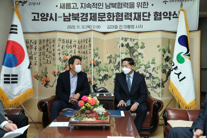 [부자동네타임즈 김인수기자] 고양시는 12일 오전 11시, (사)남북경제문화협력재단(이사장 임종석 대통령 외교안보특보, 이하 경문협)과 ‘남북 도시 간 교류협력 추진을 위한 업무협약’을 체결했다. 협약식은 평화와 민주화의 상징인 김대중 前대통령의 사저에서 진행돼 그 의미를 더했다.
