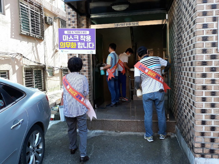 [부자동네타임즈 김인수기자] 고양시 성사2동(동장 강득모)은 지난 14일 코로나19 사회적 거리두기 2단계와 경기도 마스크 쓰기 의무화에 따라 다중이용시설, 교차로 등에서 생활속 거리두기와 올바른 마스크 착용 캠페인 및 일제방역을 실시했다.