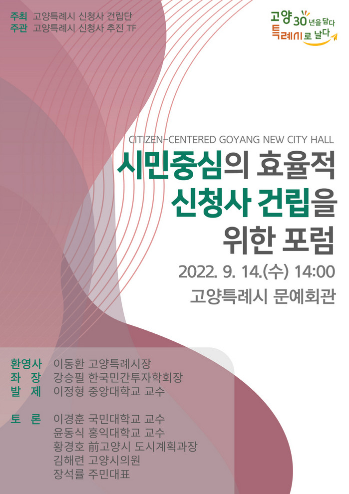 [부자동네타임즈 김인수기자] 고양특례시(시장 이동환)가 오는 9월 14일 14시 문예회관에서 고양시 신청사의 효율적 건립을 위한 포럼을 개최한다.