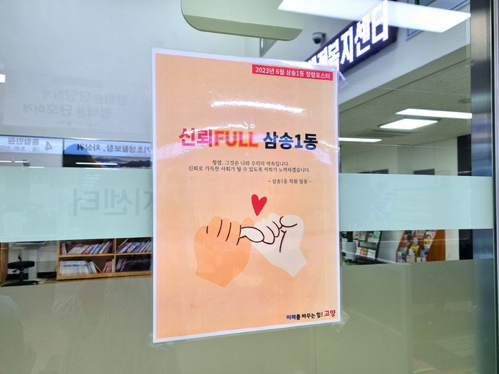 특히 지난달 직원들의 아이디어를 모아 청렴 슬로건으로 선정된 ‘신뢰FULL 삼송1동’을 활용하여 6월 청렴 포스터를 자체 제작 및 발행했으며, 이를 청사 게시판, 주민 참여 SNS 등에 게시해 부패 근절에 대한 포부를 밝혔다.
