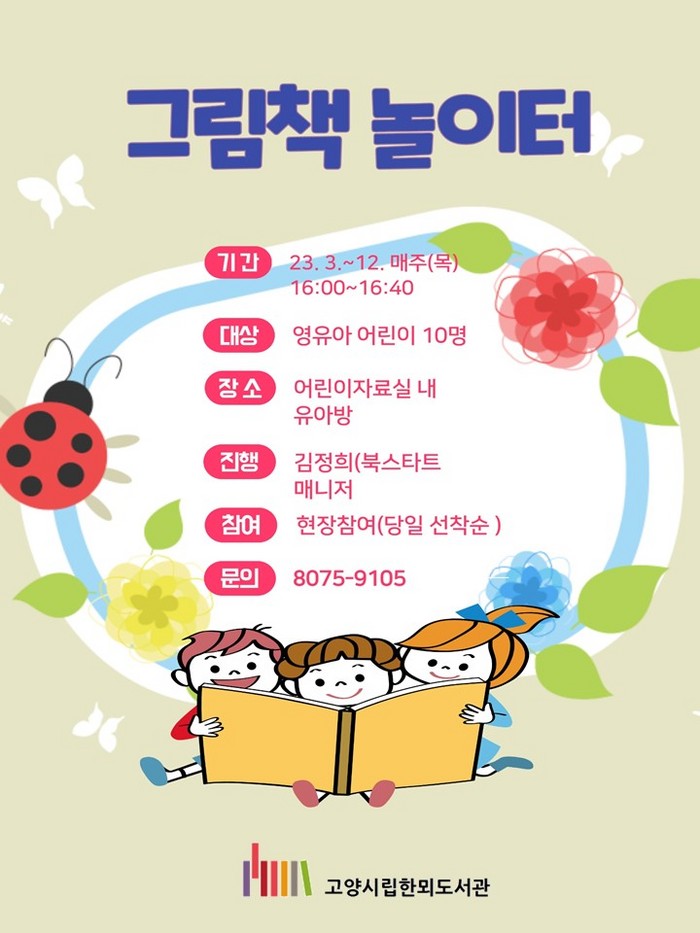 [부자동네타임즈 김인수기자] 고양특례시(시장 이동환) 한뫼도서관이 3월부터 12월까지 어린이를 위한 그림책 읽어주기 프로그램 그림책 놀이터를 운영한다.
