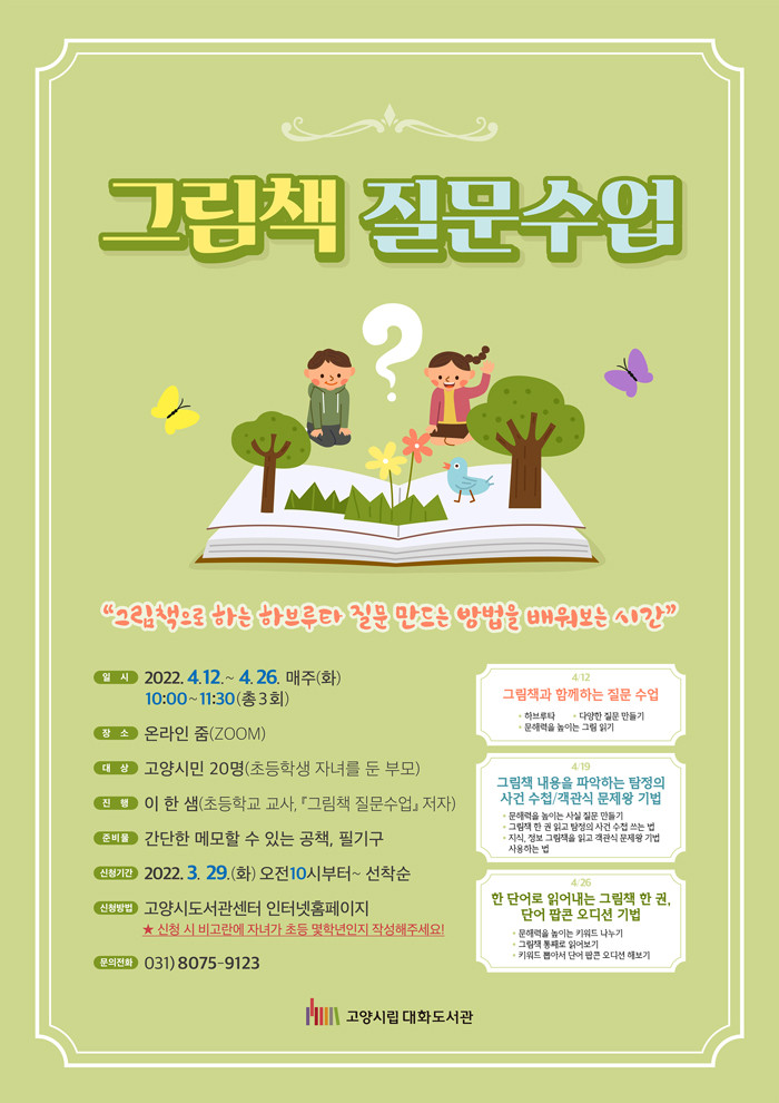 [부자동네타임즈 김인수기자] 고양시 대화도서관은 초등학생 자녀를 둔 양육자를 위한 프로그램 그림책 질문수업을 4월 12일부터 4월 26일까지 운영한다.