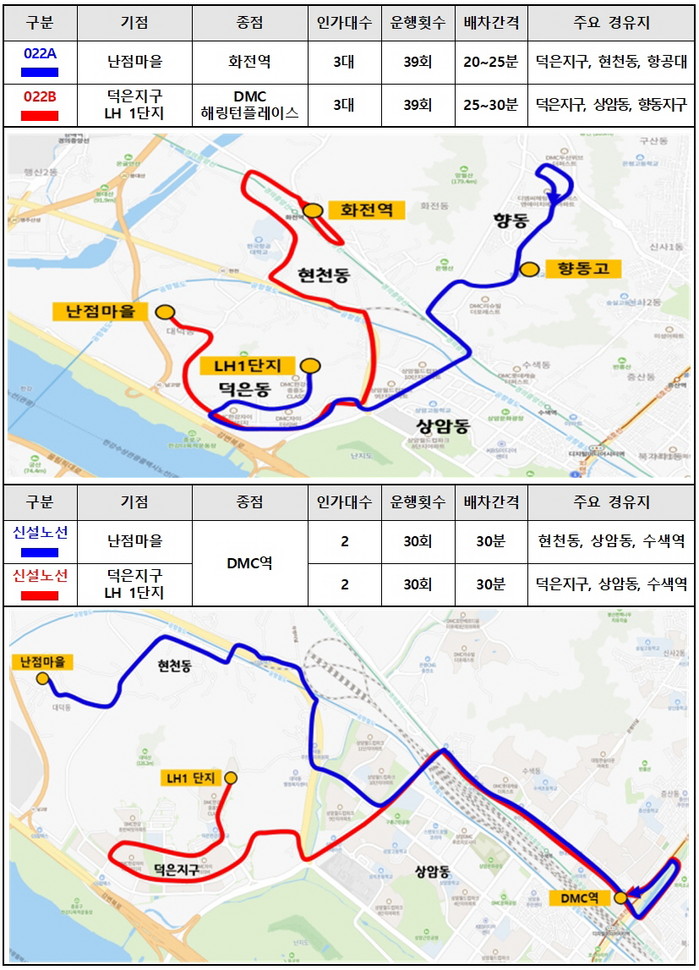 고양시 관계자는 “대덕동 주민들의 대중교통 불편 해소 방안을 서울시와 지속적으로 논의한 결과 이 같은 결실을 거뒀다”며, “기존에 운행하는 022A번과 022B번 마을버스는 이달 내에 변경된 노선으로 운행할 계획이며, 신설되는 2개 노선은 빠른 시일 내 운행할 수 있도록 하겠다”고 말했다.