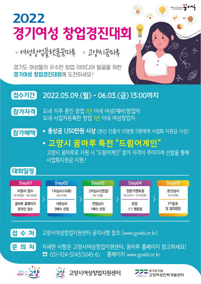 [부자동네타임즈 김인수기자] 고양시 여성창업지원센터에서 경기도에 거주하는 여성(예비)창업자와 새내기 여성창업자의 창의적 아이디어 발굴과 창업지원을 위한 ‘2022년 여성창업플랫폼 꿈마루 경기여성 창업경진대회’ 참가자를 모집한다.
