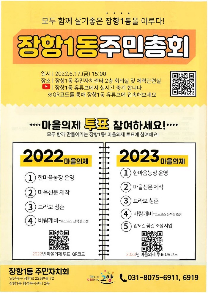 이번 장항1동 주민총회는 2021년 10월 주민자치회로의 전환 이후 처음 개최하는 주민총회이다. 이날 주민총회에서는 2022년 및 2023년 장항1동 주민자치회에서 추진할 마을사업을 연이어 결정할 예정이다.